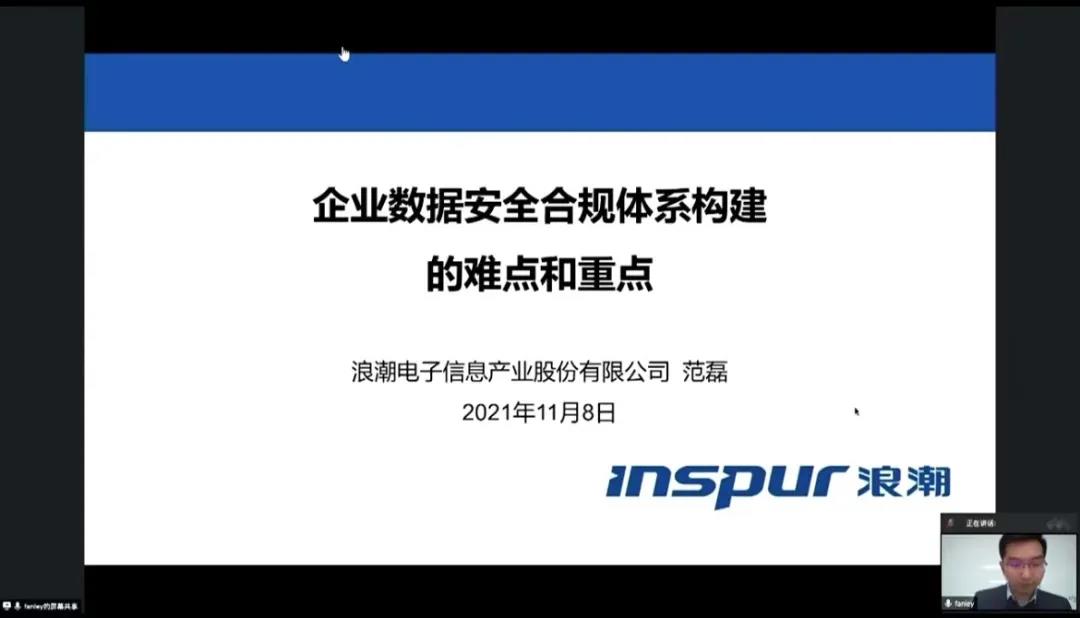 浪潮电子信息产业股份有限公司首席合规官兼合规部总经理范磊先生在线以《企业数据安全合规体系构建的难点与重点》为主题,从国内外数据安全监管形势背景出发,集中讨论了数据安全合规体系的构成要素,指出企业构建数据安全合规体系需要着眼于数据安全法律规则、数据资产识别梳理、数据全生命周期风险管控、企业数据安全内部组织管理架构等难点重点,建立安全可信的合规体系。