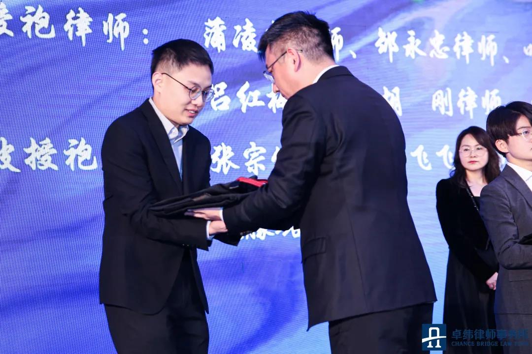 庄重的律师法袍象征着思想的成熟、判断的独立、以及对法律职业的尊重。卓纬资深合伙人蒲凌尘律师、邹永忠律师、叶强律师、王力墉律师、胡刚律师、李丽律师为青年律师张宗伟、杨飞飞、袁权、魏朦璐、周阳、林敏授予律师袍。