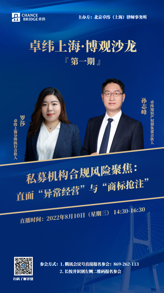 本期“博观业务沙龙”邀请卓纬上海分所执行合伙人罗莎律师、卓纬律师事务所知识产权部负责合伙人孙志峰律师作为主讲嘉宾,结合实务经验分别就私募机构的“异常经营”问题及“商标抢注”的危害与风险进行探讨,为私募机构合规风险防控提供不同方面的建议。