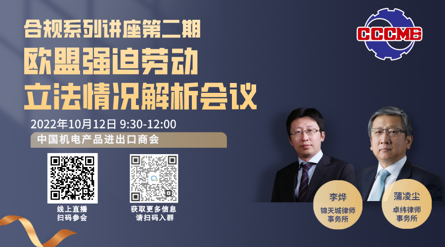 10月12日(周三)9:30-12:00,卓纬国际贸易与合规部负责合伙人蒲凌尘律师受邀做客中国机电产品进出口商会主办的合规系列讲座第二期《欧盟强迫劳动立法情况解析会议》。