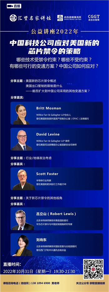10月31日(下周一)19:30-21:30,卓纬高级国际顾问吕立山先生、国际贸易与合规部高级顾问刘向东女士携手美国Willkie Farr & Gallagher律师事务所Britt Mosman律师、David Levine律师,半导体行业专家Scott Foster先生做客汇贤名家讲坛,将围绕美国新的芯片禁令以及中国科技公司的应对策略,开展主题分享。