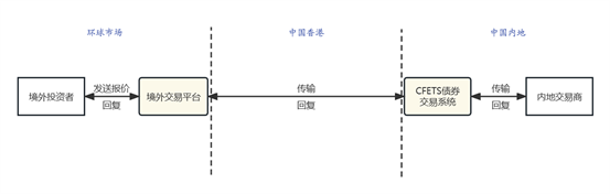 境外投资者通过Tradeweb、Bloomberg或MarketAxess境外电子交易平台向报价机构发送只含量、不含价的报价请求,报价请求实时传输至交易中心系统;报价机构通过交易中心系统向境外投资者回复可成交价格;境外投资者确认价格并在交易中心系统达成交易。如图,虽在托管层面需香港CMU次级托管作为媒介,但在报价层面并不经由香港地区的任何平台或机构,通过境外交易平台和中国内地CFETS的直接对接实现互联互通。