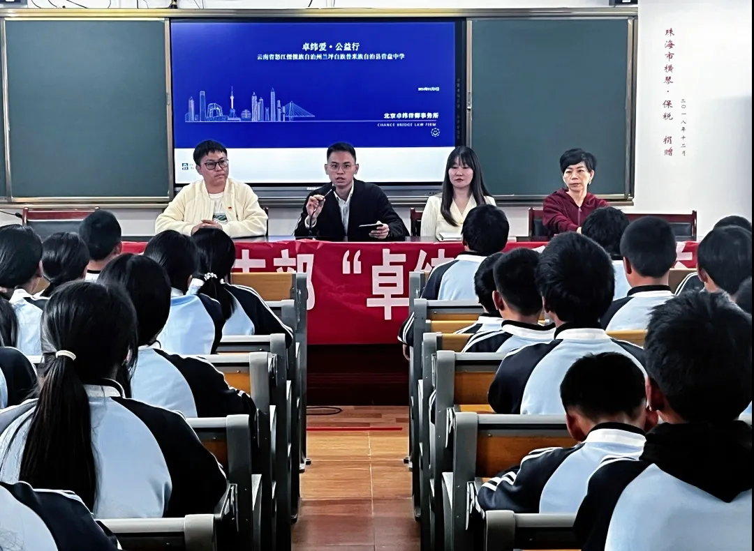 2024年11月1日至11月7日,卓纬律师事务所开展了“公益悦动周”的系列活动。作为活动的重要组成部分,卓纬组织来自北京、上海和深圳三地办公室的律师代表罗文慧、林敏、沈小旭和王睿,前往云南省怒江傈僳族自治州兰坪白族普米族自治县,走进兰坪营盘中学,将法律知识与温暖送到学生身边。在“公益悦动周”期间,号召每位同事积极参与运动挑战,每完成一次运动挑战,卓纬便会向偏远地区的学校捐赠一笔公益基金,以实际行动传递关爱。