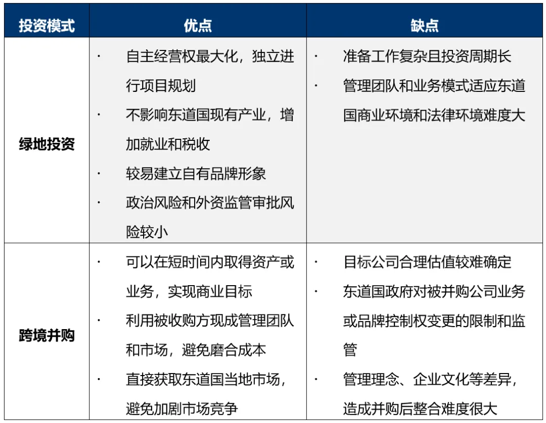 中国企业应综合考虑自身所属行业性质、投资目的和东道国的投资环境、监管政策等,选择符合自身的海外投资模式。