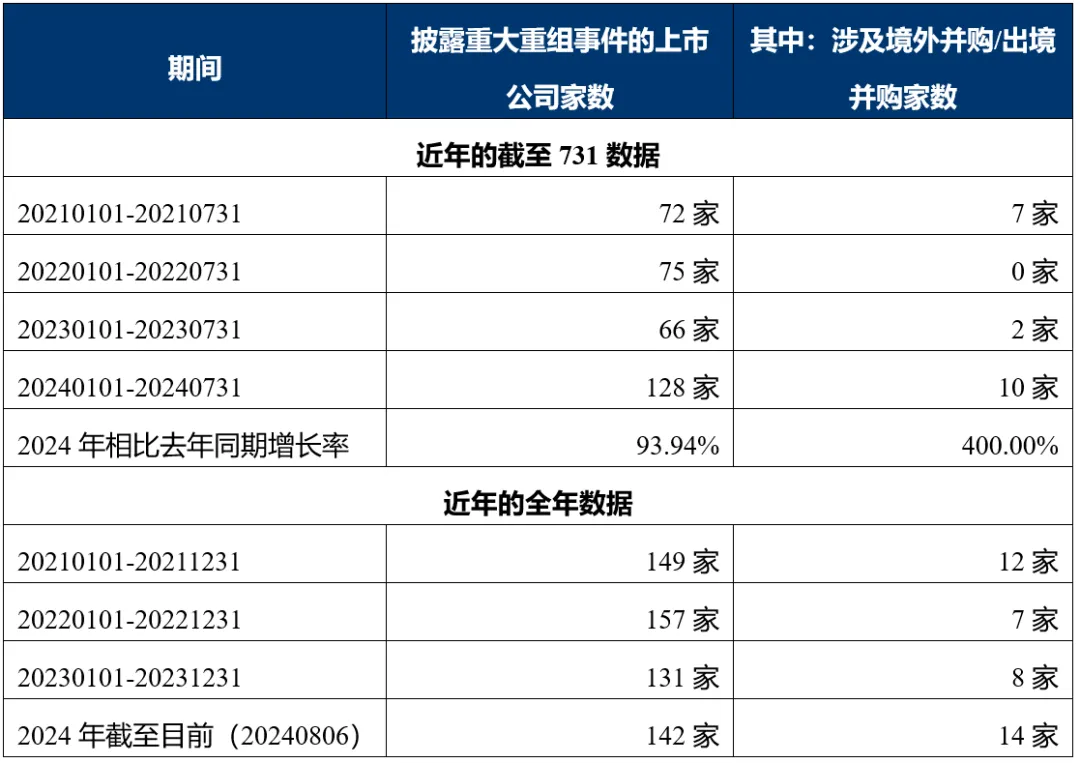 在业务需求和政策引导的双重推动之下,截至2024年7月31日,A股市场合计有128家上市公司更新披露了重大重组事件公告,几乎与2023年全年131家的数量持平,其中涉及境外并购或出境并购10家,已超2023年全年的8家。具体数据如下: