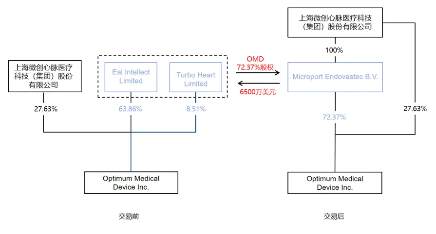 心脉医疗(688016)2024年7月2日发布公告称,全资子公司Microport Endovastec B.V.(荷兰心脉)受让Earl Intellect Limited、Turbo Heart Limited合计持有的公司联营公司Optimum Medical Device Inc.(以下简称“OMD”)72.37%股权。本次交易完成后,OMD将成为公司全资子公司。
