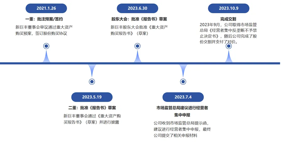 2023年9月,新巨丰通过协议转让方式收购纷美包装部分已发行普通股,成为标的公司第一大股东,完成第一步收购,尚未对标的公司形成控制。由于买方与标的公司为业务协同关系,本次并一方面遭遇了买方和标的公司客户存在竞争关系等阻力,另一方面由于交易规模较大,涉及了重大资产重组程序性问题。又因双方于并购后期补办中国反垄断申报,导致交割时间延迟了数月。