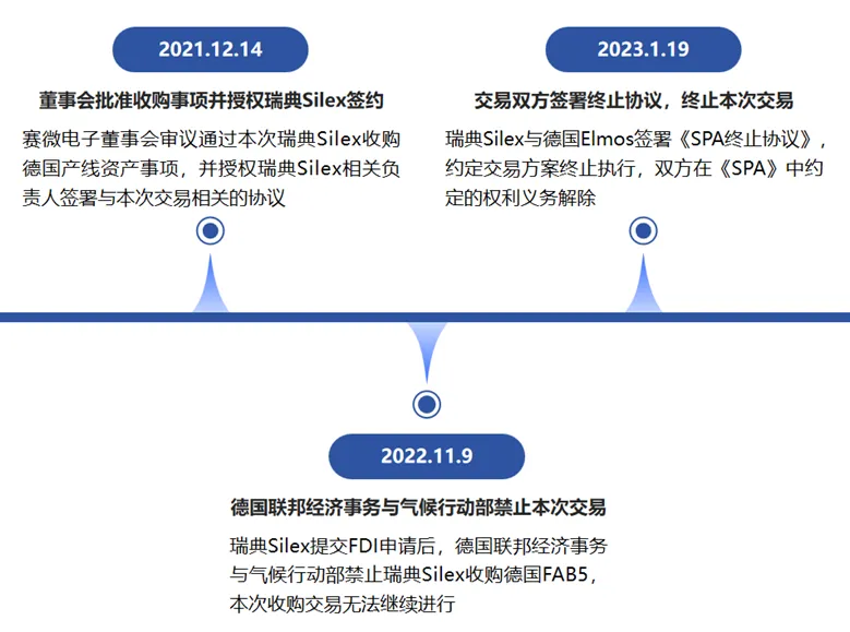 2023年1月20日,赛微电子(证券代码:300456)发布公告称,2022年11月9日,公司及境内外相关子公司收到德国联邦经济事务与气候行动部(Federal Ministry for Economic Affairs and Climate Action)的正式决定文件,禁止瑞典Silex收购德国FAB5。2023年1月19日,瑞典Silex与德国Elmos签署《SPA终止协议》,代表着赛微电子该项汽车芯片产业及相关业务的海外拓展布局已终止。