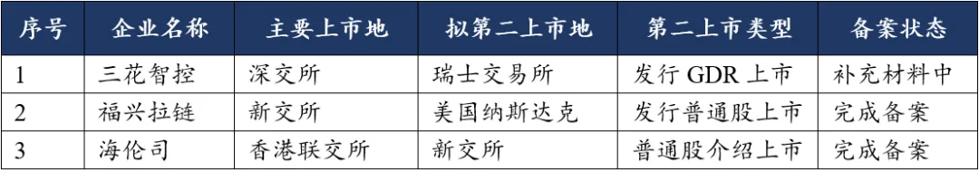 从以上案例中可以看出,目前境内企业赴境外作第二上市的整体数量占全部境外发行上市项目的比例较小。但也覆盖了A股公司发行GDR以及境外上市公司前往新交所第二上市等主要的第二上市类型。在上述案例中,因三花智控为深交所的上市公司,同时涉及新增的境内基础A股股份的发行及GDR的发行,除在中国证监会进行发行上市备案外,就其境内基础证券的发行需要经过深交所审核及中国证监会的注册。
