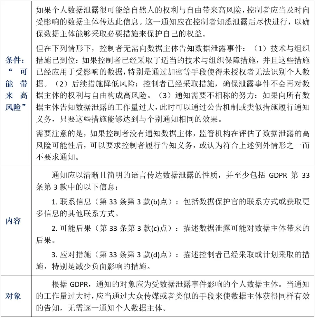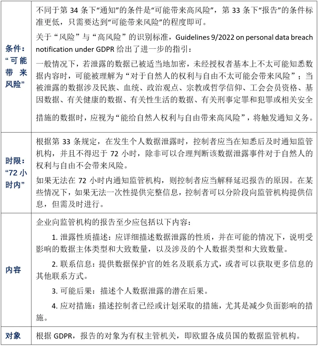 GDPRµÚ33Ìõ¹æ¶¨ÁËÔÚ¸öÈËÊý¾Ýй¶Ê¼þÖУ¬Êý¾Ý¿ØÖÆÕߺʹ¦ÀíÕߵı¨¸æÒåÎñ£¬¼´Èç¹û·¢Éú¸öÈËÊý¾Ýй¶£¬Êý¾Ý¿ØÖÆÕß±ØÐëÔÚÖªÏþй¶ºó²»³ÙÓÚ72СʱÄÚÏòÏà¹ØµÄ¼à¹Ü»ú¹¹±¨¸æ£¬³ý·ÇÄܹ»Ö¤Ã÷Êý¾Ýй¶²»Ì«¿ÉÄܶÔÊý¾ÝÖ÷ÌåµÄȨÀûºÍ×ÔÓÉÔì³É·çÏÕ¡£Èç¹û²»ÄÜÔÚ72СʱÄÚ±¨¸æ£¬ÔòÐèÒªÌṩ³Ù½»µÄÀíÓÉ¡£GDPRµÚ34Ìõ¹æ¶¨Á˵±¸öÈËÊý¾Ýй¶¿ÉÄܶÔÊý¾ÝÖ÷ÌåµÄȨÀûºÍ×ÔÓɹ¹³É¸ß·çÏÕʱ£¬¿ØÖÆÕßÏòÊý¾ÝÖ÷Ìå´«´ïй¶ÐÅÏ¢µÄÒåÎñ£¬¼´µ±¸öÈËÊý¾Ýй¶Ê¼þ¿ÉÄܶÔÊý¾ÝÖ÷ÌåµÄȨÀûºÍ×ÔÓɹ¹³É¸ß·çÏÕʱ£¬Êý¾Ý¿ØÖÆÕßÓÐÒåÎñ¡°ÎÞ²»µ±ÑÓÎ󵨡±Í¨ÖªÊÜÓ°ÏìµÄÊý¾ÝÖ÷Ìå¡£¶ÔÓÚGDPRµÚ33ÌõºÍµÚ34ÌõµÄÒªµã½â¶Á£¬»ã×ÜÈçÏ£º