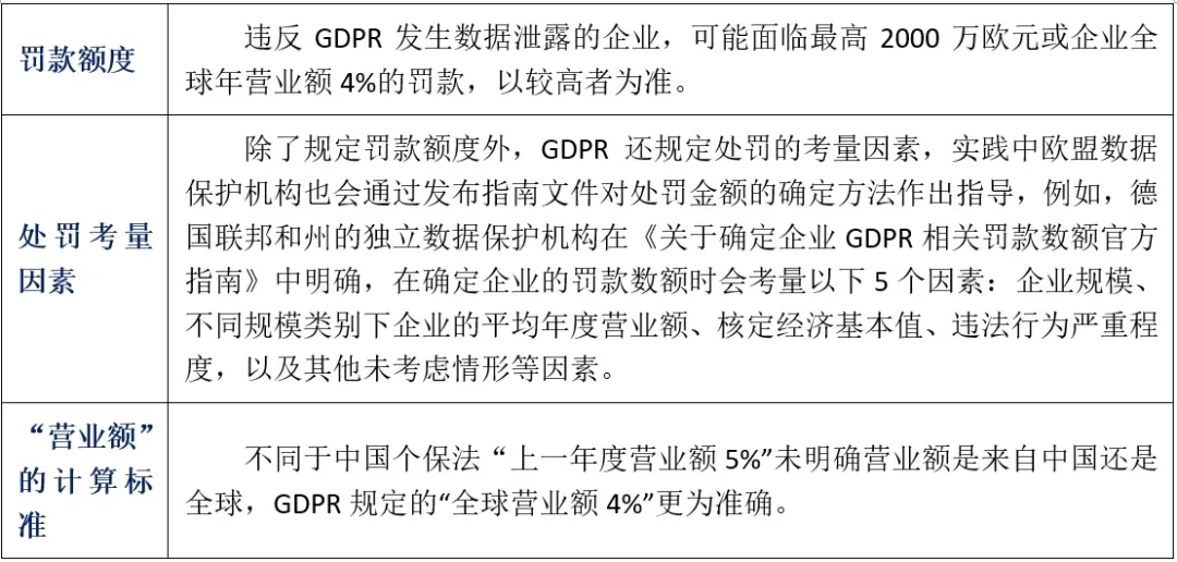 Ïà½ÏÓÚÖйúµÄ¡¶¸öÈËÐÅÏ¢±£»¤·¨¡·µÄÁýͳ¹æ¶¨£¬GDPRÃ÷È·¹æ¶¨ÁËÆóҵΥ¹æ·¢ÉúÊý¾Ýй¶Ê¼þÊ±ÃæÁÙ´¦·£Êý¶îµÄ¿¼Á¿ÒòËØ¡¢Õë¶ÔÊÊÓõÄÎ¥·¨ÇéÐκÍÓªÒµ¶î¼ÆËãµÄ·¶Î§¡£
