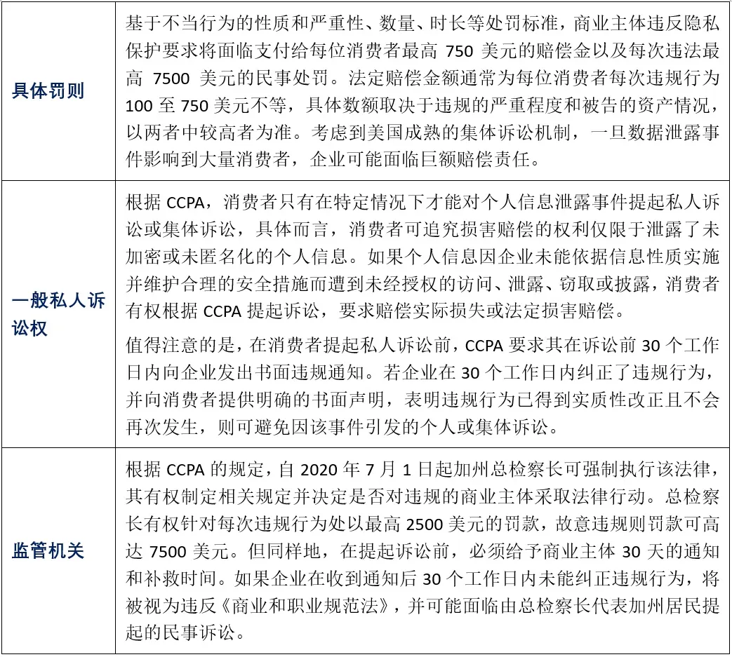 ÔÚ·¨ÂÉÔðÈη½Ã棬CCPA²ÉÓÃÁË¡°ÃñÊÂËßËÏ+Õþ¸®ËßËÏ¡±µÄË«¹ìÖÆ³Í·£»úÖÆ£¬Î¥¹æÆóÒµÔÚ·¢ÉúÊý¾Ýй¶Ê¼þʱÈôδ×ñÊØCCPAËù¹æ¶¨µÄÒåÎñ£¬¿ÉÄÜÃæÁÙÖÚ¶àÏû·ÑÕß·¢ÆðµÄ¼¯ÌåËßËϺ͸߶¿î£¬·£¿î½ð¶î¸ù¾ÝÇé½ÚÑÏÖØ³Ì¶ÈºÍÆóÒµ¹æÄ£¶ø¶¨¡£