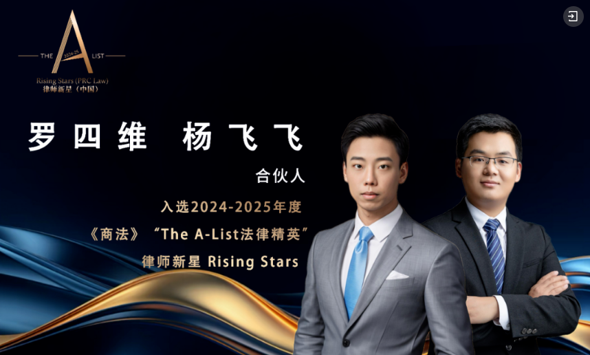 2025年2月26日,亚洲顶级法律评级杂志《商法》(China Business Law Journal)公布了“2024-2025年度The A-List 法律精英:律师新星”榜单,卓纬律师事务所合伙人罗四维、杨飞飞律师凭借深厚的专业素养、广泛的行业认可和出色的市场表现,荣获“律师新星(Rising Stars)”称号。