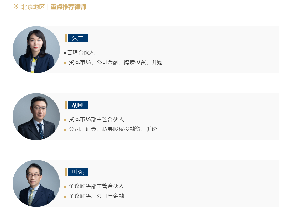 The Legal 500评价:Chance Bridge Partners has a strong practice that covers capital markets, commercial disputes, intellectual property and antitrust. The firm displays in-depth sector expertise in the banking, securities, insurance, funds, e-commerce and real estate sectors. The firm has significantly expanded its banking and finance practice, as well as further bolstering its dispute resolution team. Managing partner Ning Zhu and Gang Hu, head of capital markets, are two key names to note. Qiang Ye is also noted, who specialises in dispute resolution.
