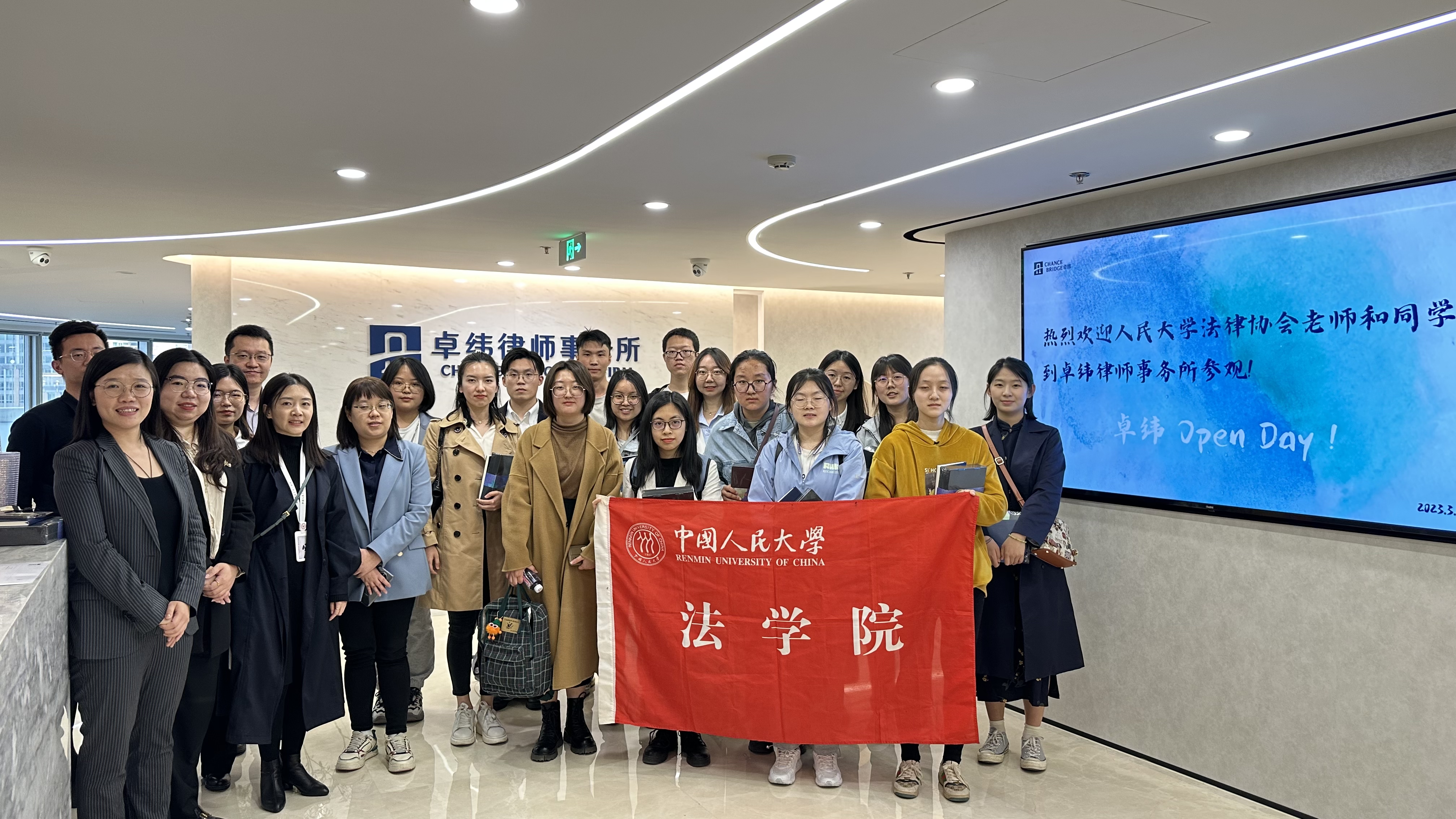 2023年3月29日,中国人民大学法律协会(以下简称“人大法协”)与卓纬律师事务所(以下简称“卓纬”)共同组织了卓纬Open Day律所参访活动。人大法协的师生十六人及部分来自其他高校的同学,到访东长安街1号——卓纬北京办公室参观交流。