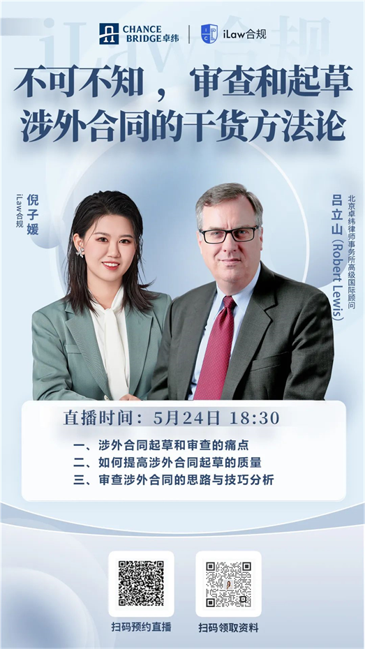2023年5月24日(星期三)18:30,卓纬高级国际顾问吕立山(Robert Lewis)律师受邀iLaw合规,将结合实务经验以《不可不知,审查和起草涉外合同的干货方法论》为题展开线上对话交流。