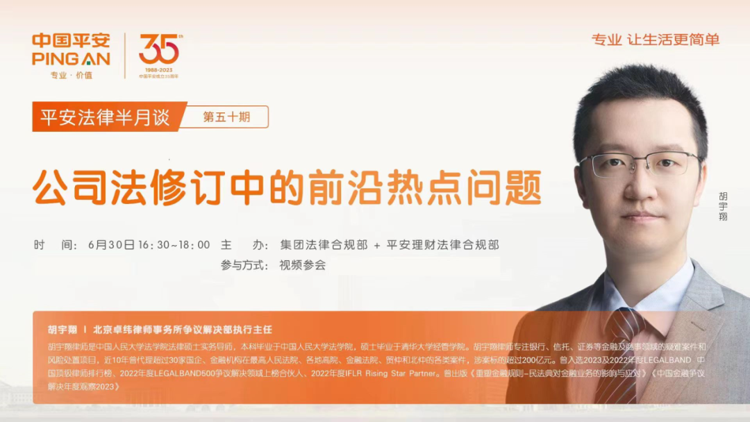 近日,卓纬争议解决部合伙人胡宇翔受邀参与由中国平安集团合规部和平安理财法律合规部共同主办的平安法律半月谈第五十期,围绕“公司法修订中的前沿热点问题”为企业客户提供专题培训。