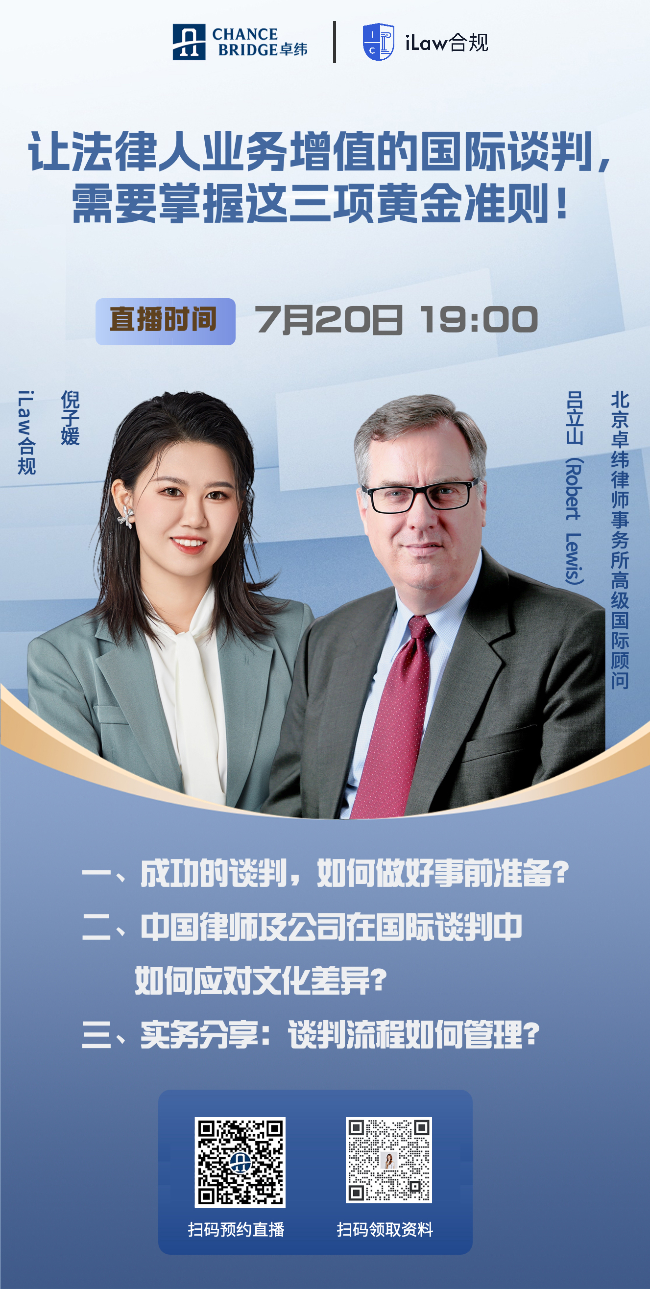 2023年7月20日(星期四)19:00 ,卓纬高级国际顾问吕立山(Robert Lewis)律师受邀iLaw合规,将结合实务经验以《让法律人业务增值的国际谈判,需要掌握这三项黄金准则!》为题展开线上对话交流。
