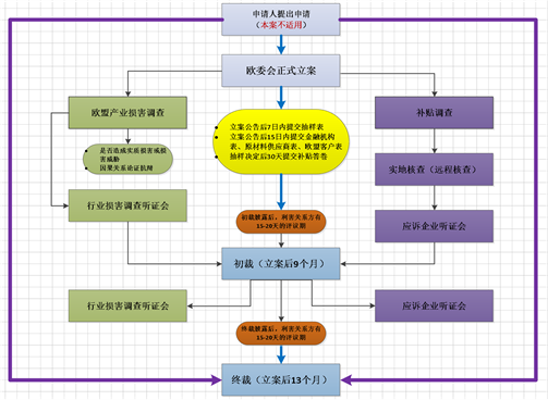 从立案到终裁,欧盟反补贴调查最迟要在13个月内结案,调查程序包括立案阶段,抽样阶段,答卷阶段,核查阶段,初裁阶段以及终裁阶段,具体如下图: