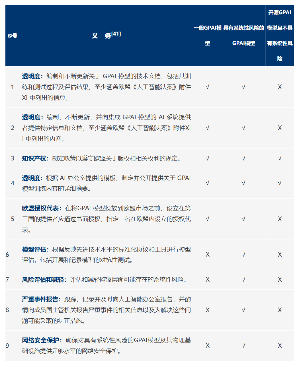 为便于直观了解,GPAI模型提供者的义务矩阵梳理如下: